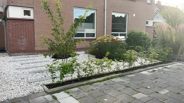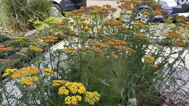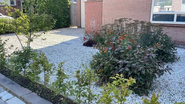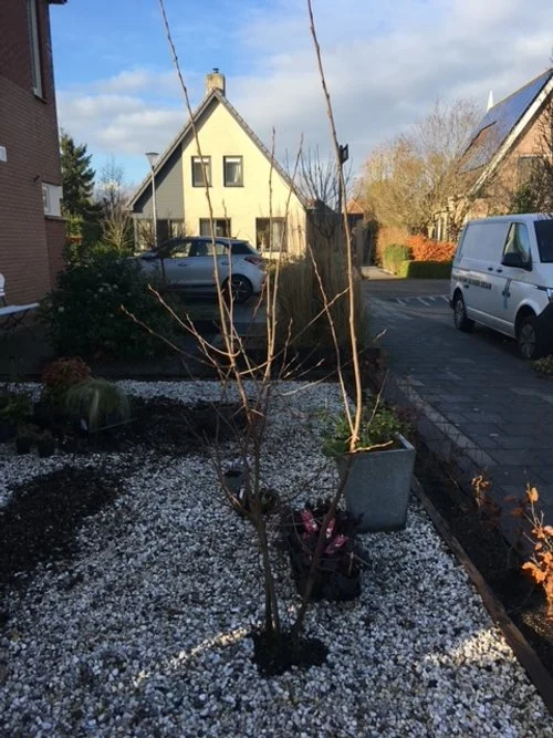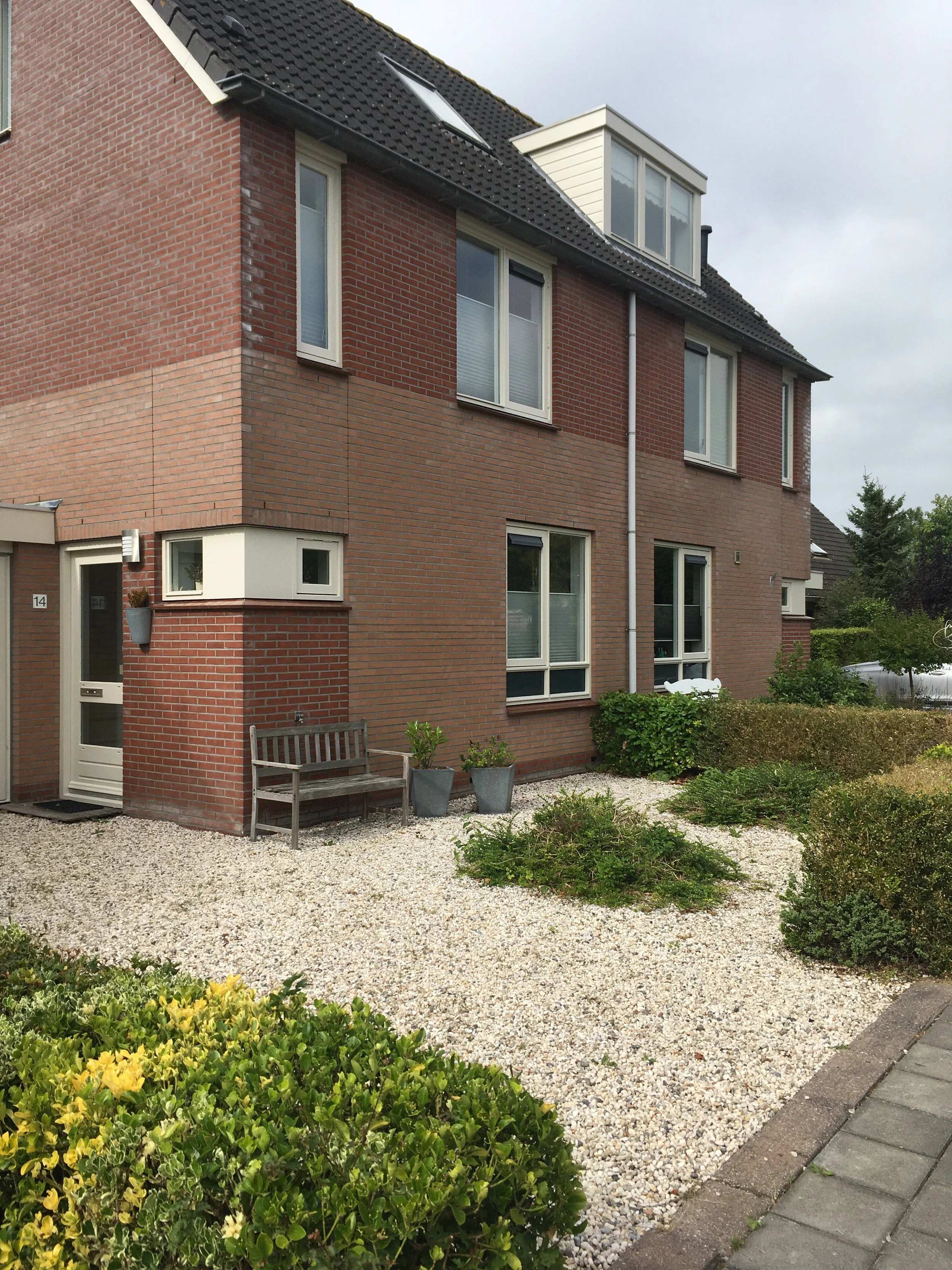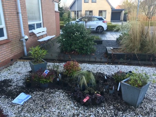 De opdracht was om van een wat saaie onderhoudsarme voortuin een kleurrijkere, groenere, maar nog steeds onderhoudsarme voortuin te maken, die ook meer insecten zou aantrekken. Het grind wat er al lag moest ook behouden worden en dus heb ik een beplantingsplan gemaakt.